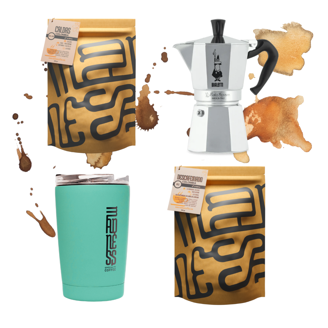 El pack incluye dos bolsas de cafe de finca, una cafetera italiana para preparar tus cafes favoritos y un vaso térmico para mantener la temperatura de tu café.